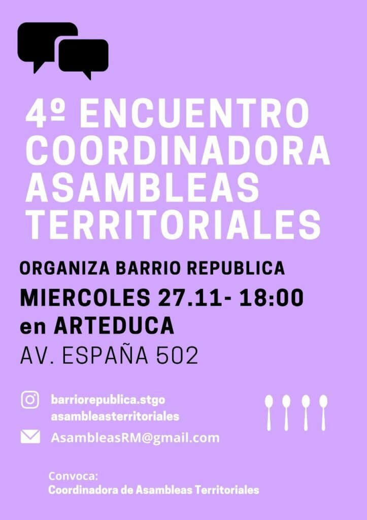 Junto con saludar, por la presente invitamos a las Asambleas Territoriales de la Región Metropolitana a participar del 4to Encuentro convocado por la Coordinadora de Asambleas Territoriales (CAT).